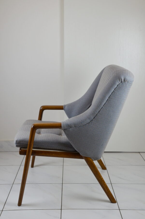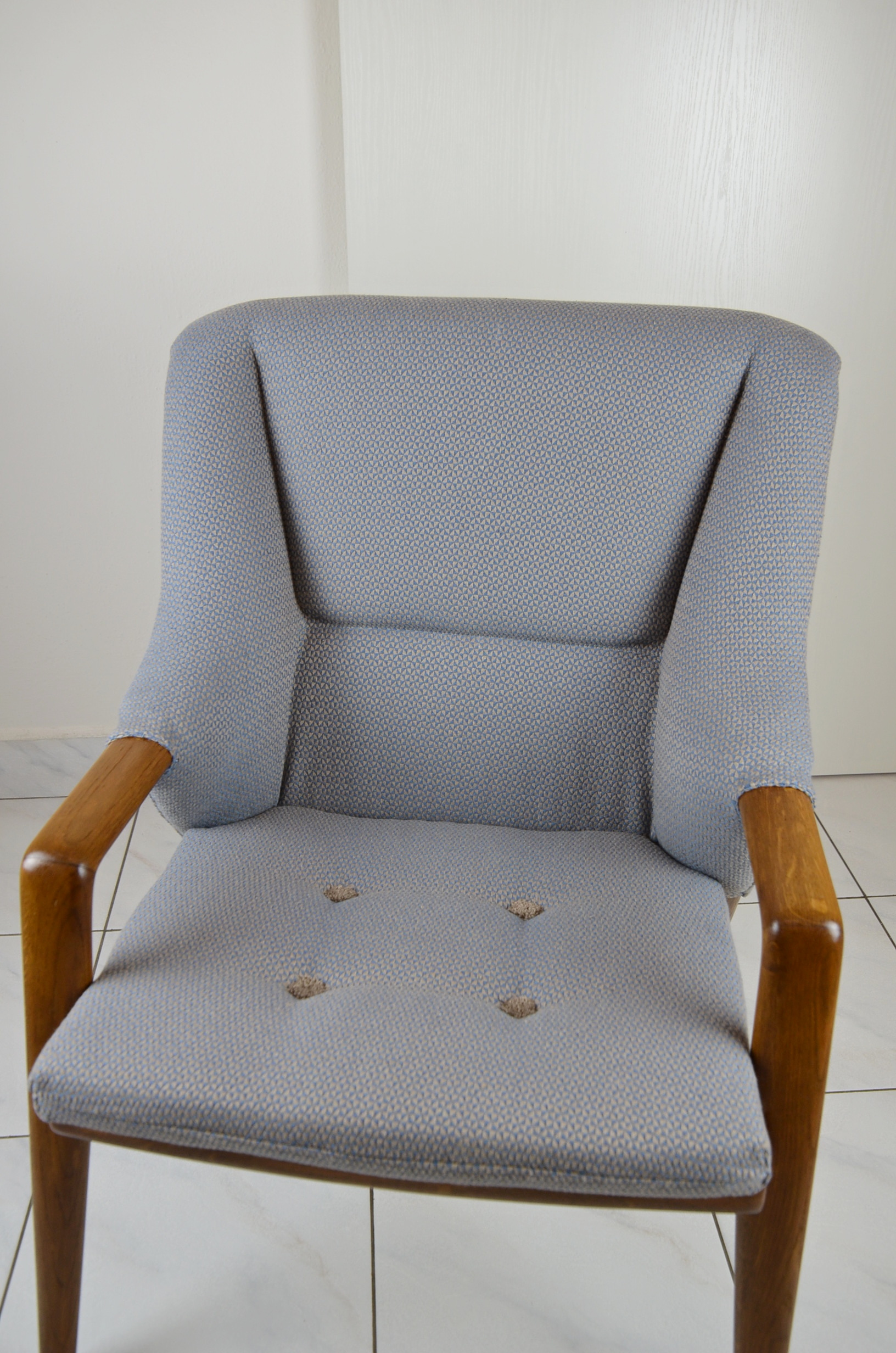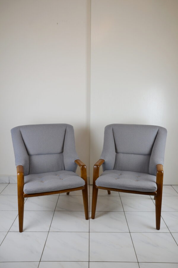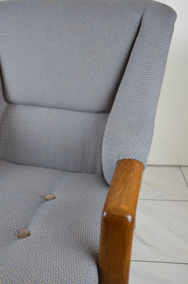 Pohodlné křesla s pevnou konstrukcí a kvalitní dřevěnou opěrkou. U křesel proběhla kompletní renovace včetně čalounění do nové art-deco látky.